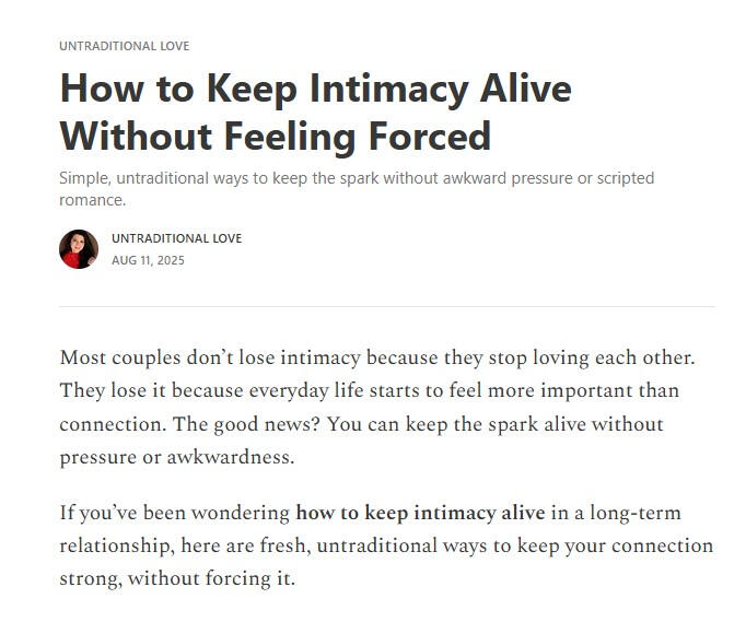 Our relationship has stayed fun, peaceful, passionate, and real...not because we follow the rules, but because we let go of the ones that never made sense for us.I wrote Untraditional Love because I want couples everywhere to experience that same kind of connection, the kind that still feels new after ten years, not because it’s perfect, but because it’s intentional.This isn’t a book about fixing what’s broken. It’s about protecting what’s beautiful.